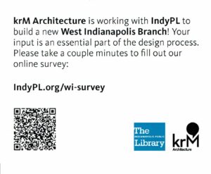 At last Saturday’s WINC meeting, the Capital Projects Manager of Indianapolis Public Library and architects from krM Architecture discussed future designs for our library at WINC’s meeting last Saturday. If you weren’t able to make it, please click here fill out this community input survey to help design a branch that serves our needs or use the QR code below. You can also access the survey by clicking on the image.